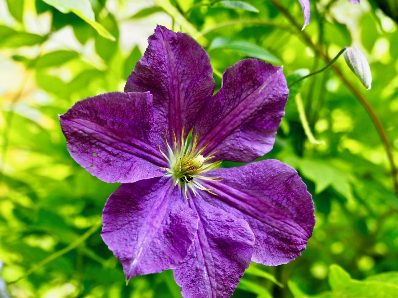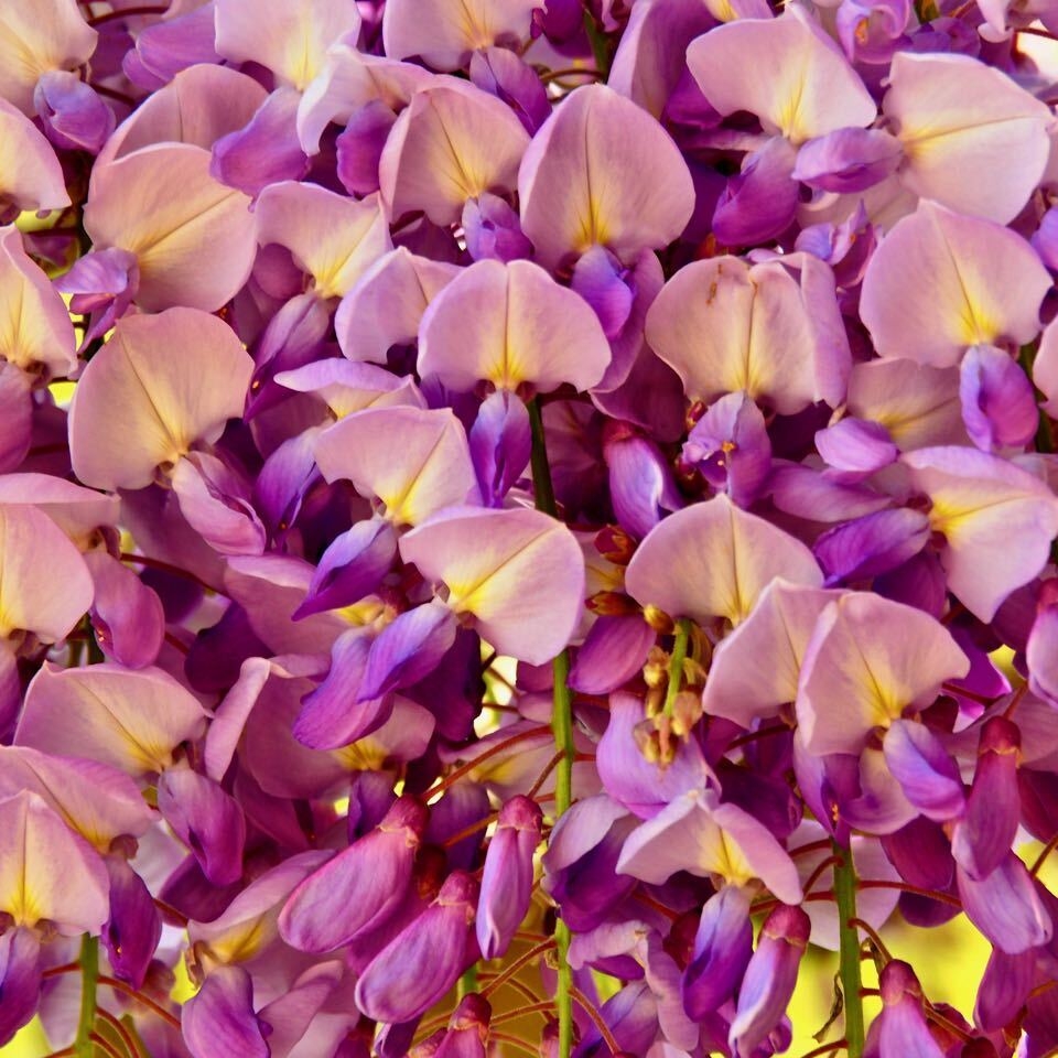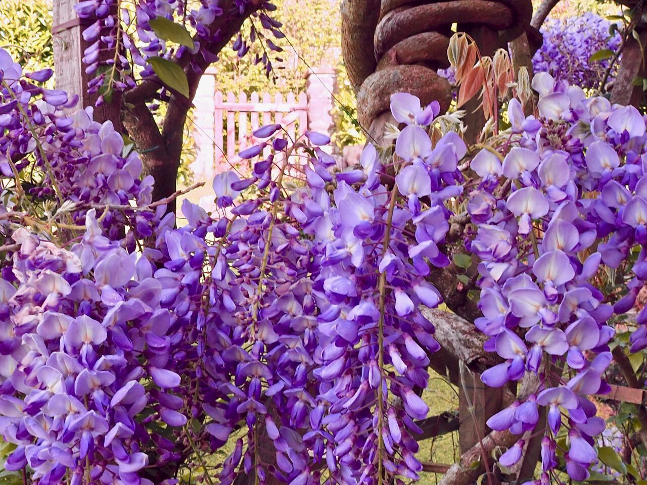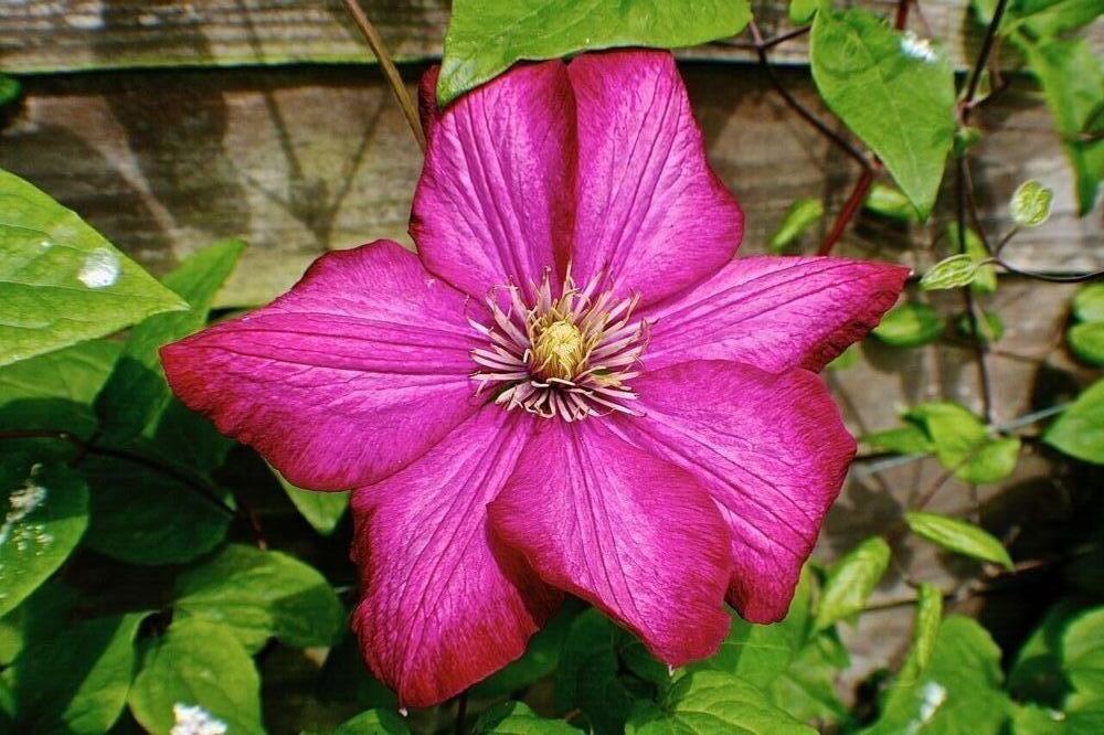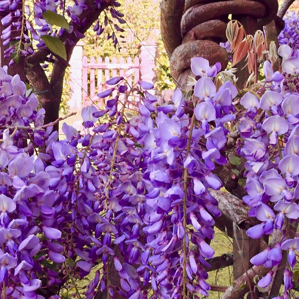 Clematis (which we're not very good at growing) shares the trellis with our Wisteria